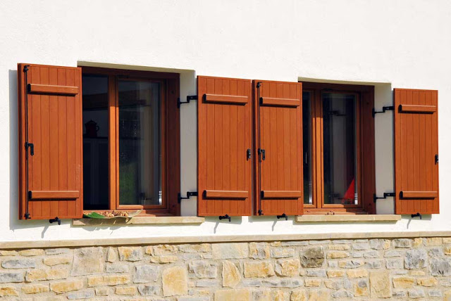 Carpintería exterior a base de puertas y ventanas de PVC en color imitación a madera y contraventanas exteriores de aluminio Sistema Porticón con decoración D (travesaños horizontales) en planta baja y persiana de aluminio con cajón monoblock y accionamiento a cardan.